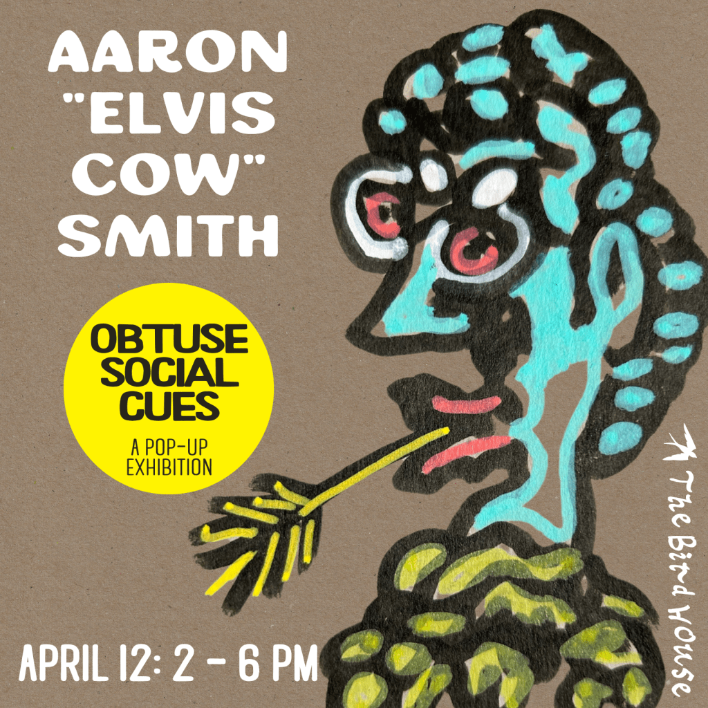 Tulsa-based artist Aaron “Elvis Cow” Smith! “Obtuse Social Cues” transforms the space into a sensory-overload funhouse, bursting with Aaron’s vivid, enigmatic mixed-media work. Graffiti spills across eclectic surfaces, familiar shapes emerge and dissolve—chaotic, magnetic, and impossible to ignore. It’s physical and fleeting, joyful and unnerving. Art made for friends, for the thrill of it, because there’s no other way. Curated by Brad Rose.